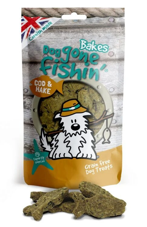 Dog Gone Fishin’ Cod and Hake Bakes are delicious baked dog treats made with succulent Cod & Hake. A healthy low calorie snack, reward or training treat for your dog.