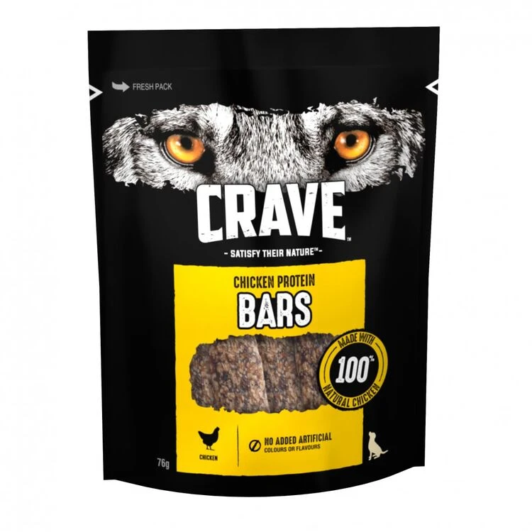 Crave Chicken Protein Bars are dog treats made with high quality ingredients; including 100% natural chicken, providing a delicious source of protein for your pet. Made with no added artificial colours or flavours; for a taste dogs will instinctively love. Craveâ„¢ Chicken Protein Bars come in a fresh, resealable pack to help keep them fresh.