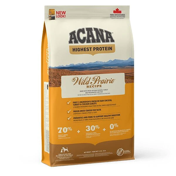 ACANA Wild Prairie Dog is formulated to meet the nutritional levels established by FEDIAF for All Life Stages, except for growth of Great Dane puppies prior to 14 weeks. Store in a cool, dry place. Not fit for human consumption. | Metabolizable Energy is 3850 kcal/kg (462 kcal per 250ml/120g cup), with 36% from protein, 24% from carbohydrates, and 40% from fat.