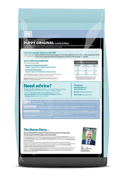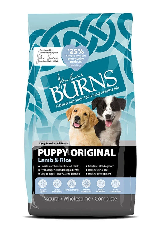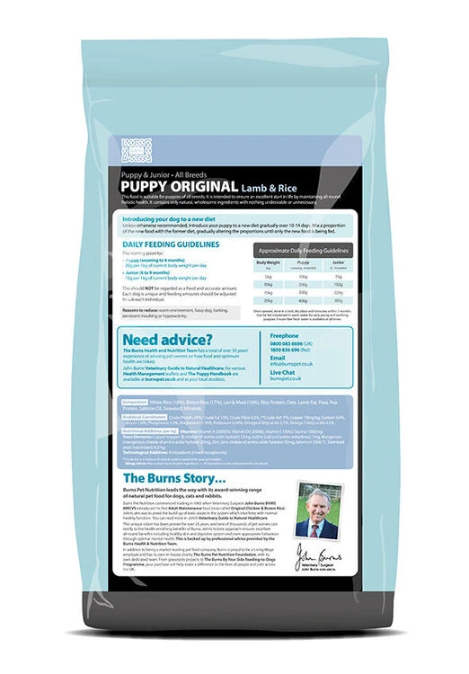 Burns Puppy Original (lamb & rice) Suitable for puppy & junior dogs. Suitable for all breeds from weaning to 9 months old. BENEFITS: Healthy skin and coat, Healthy Digestion, Healthy Development, Naturally Delicious, Hypo-Allergenic & Complete. Burns Puppy Original is a complete, balanced, highly palatable premium food for all breeds of puppy. Burns puppy range contains all the essential nutrients puppies need, so they grow and develop into happy and healthy adults. Our puppy diets are made using only the finest, easily digested ingredients. Our puppy diets contain controlled levels of protein, fat and minerals promoting slow growth, reducing strain on developing bones and joints. All Burns diets are formulated without ingredients which commonly cause food intolerance, such as wheat, soya, dairy, artificial colourings, artificial flavourings and artificial preservatives. Burns puppy diets provide all the nutrients needed for puppies’ healthy development, ensuring they grow into happy and healthy adults.