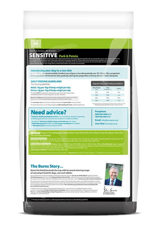 Burns Sensitive Pork and Potato Adult & Senior Dog Food is perfect for pets who suffer with bad digestion or sensitive skin, made without wheat in a hypoallergenic recipe.