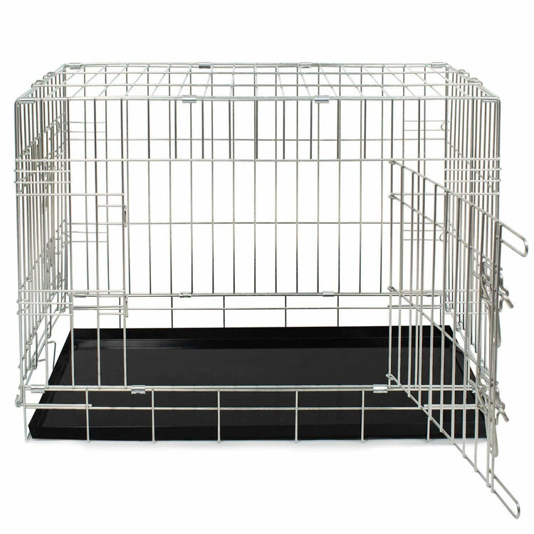 Two door metal dog crate by Lords & Labradors. Two doors for very easy access and exit both with heavy duty latches. With thicker bars than standard crates. There is a black metal floor tray that is easily removable for cleaning, great for puppies that love to chew! Includes a moveable carrying handle the crate folds flat for easy transportation or storage. 100% pet safe galvanised metal