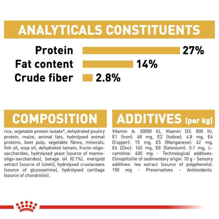Ingredients: Rice, vegetable protein isolate*, dehydrated poultry protein, maize, animal fats, hydrolysed animal proteins, beet pulp, vegetable fibres, minerals, fish oil, soya oil, dehydrated tomato, fructo-oligo-saccharides, hydrolysed yeast (source of manno-oligo-saccharides), borage oil (0,1%), marigold extract (source of lutein), hydrolysed crustaceans (source of glucosamine), hydrolysed cartilage (source of chondroitin).