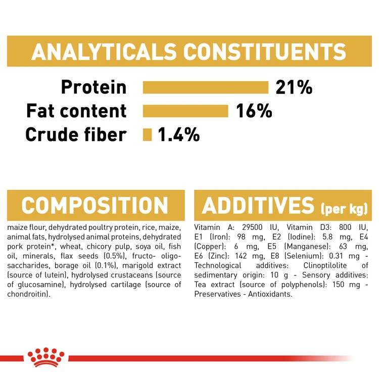 Ingredients: Maize flour, dehydrated poultry protein, rice, maize, animal fats, hydrolysed animal proteins, dehydrated pork protein*, wheat, chicory pulp, soya oil, fish oil, minerals, flax seeds (0.5%), fructo-oligo-saccharides, borage oil (0.1%), marigold extract (source of lutein), hydrolysed crustaceans (source of glucosamine), hydrolysed cartilage (source of chondroitin). *L.I.P.: protein selected for its very high digestibility.